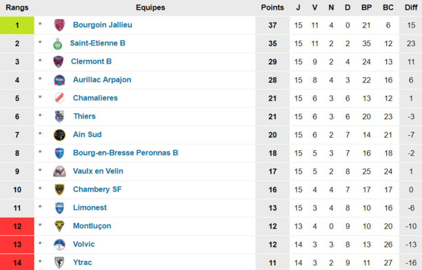 Le FC Bourgoin est premier avec onze succès, quatre nuls et aucun revers. Il a inscrit vingt-et-un buts et en a encaissé six.