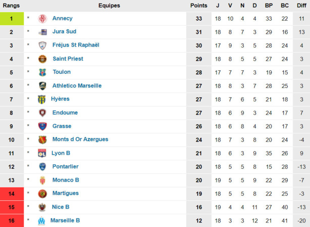 L'EFC Fréjus-Saint-Raphael est troisième avec trente points, neuf succès, trois nuls et cinq revers. Il a marqué vingt-huit buts et en a encaissé vingt-quatre.